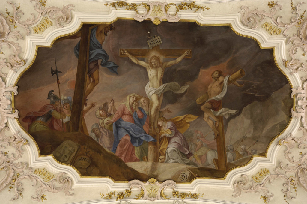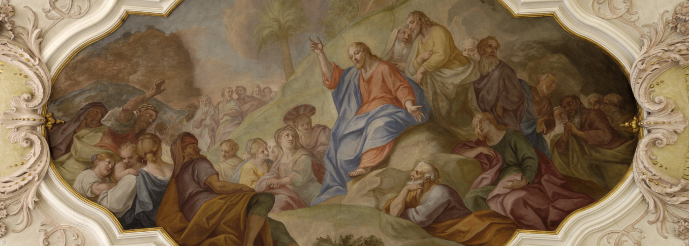 Die drei Fresken zeigen eine Zusammenfassung des Wirkens Christi: Jesus bei der Bergpredigt, Jesus am Kreuz und Jesus als Retter beim jüngsten Gericht. In den Kartuschen daneben ist als Erläuterung dazu das dreifache Amt Jesu auf lateinisch genannt und bedeutet übersetzt: Jesus der Prophet - Jesus der Priester - Jesus der König.